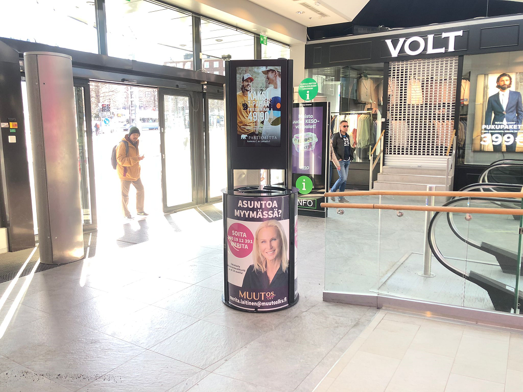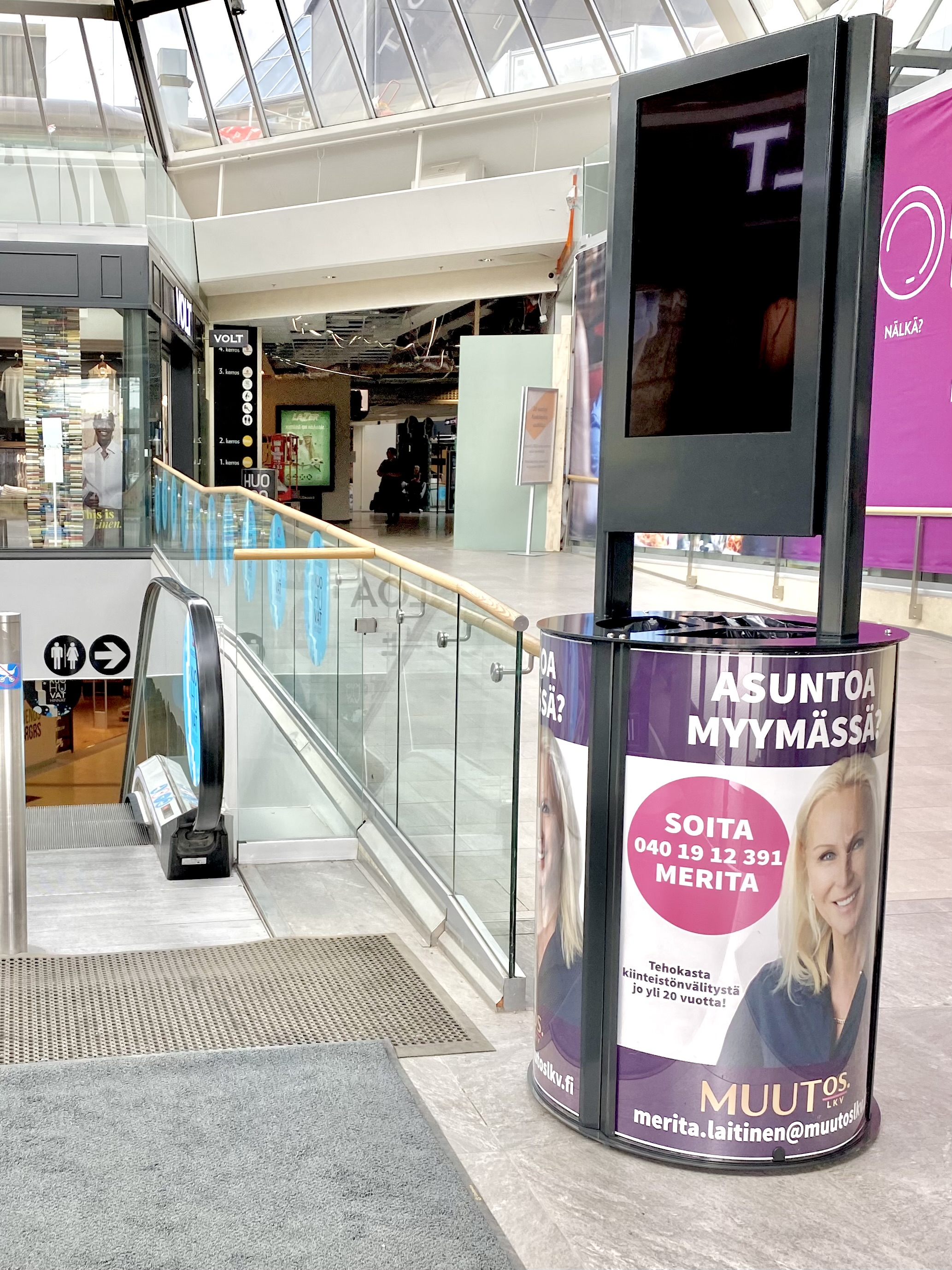 | Kuvaus | Tavoita kuluttajat tehokkaasti läheltä ostopaikkaa. Digibinit sijaitsevat kauppakeskusten parhailla paikoilla. Digitaaliset mainosnäytöt on sijoitettu optimaaliselle katselukorkeudelle, jolloin viestisi on helppo huomata. Digibin on uudenlainen mainoslaite, jossa moderniin mainosroskikseen on integroitu myös digitaalinen mainosnäyttö. Lisätietoa Digibineistä täältä www.digibin.fi |