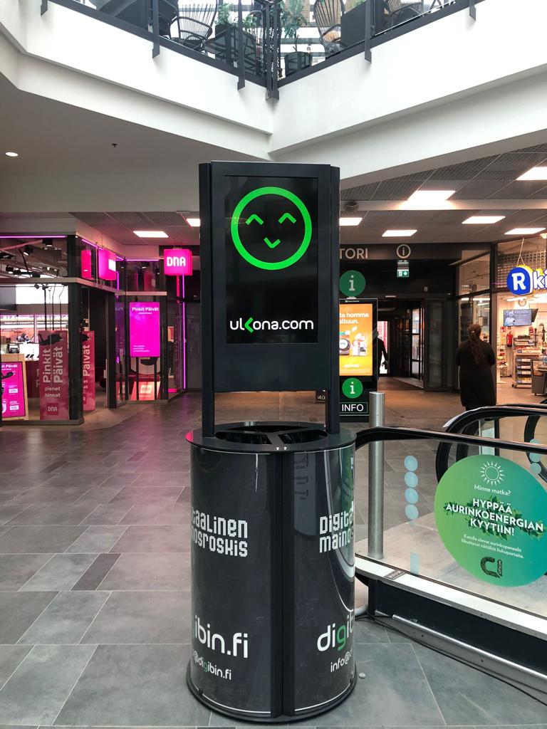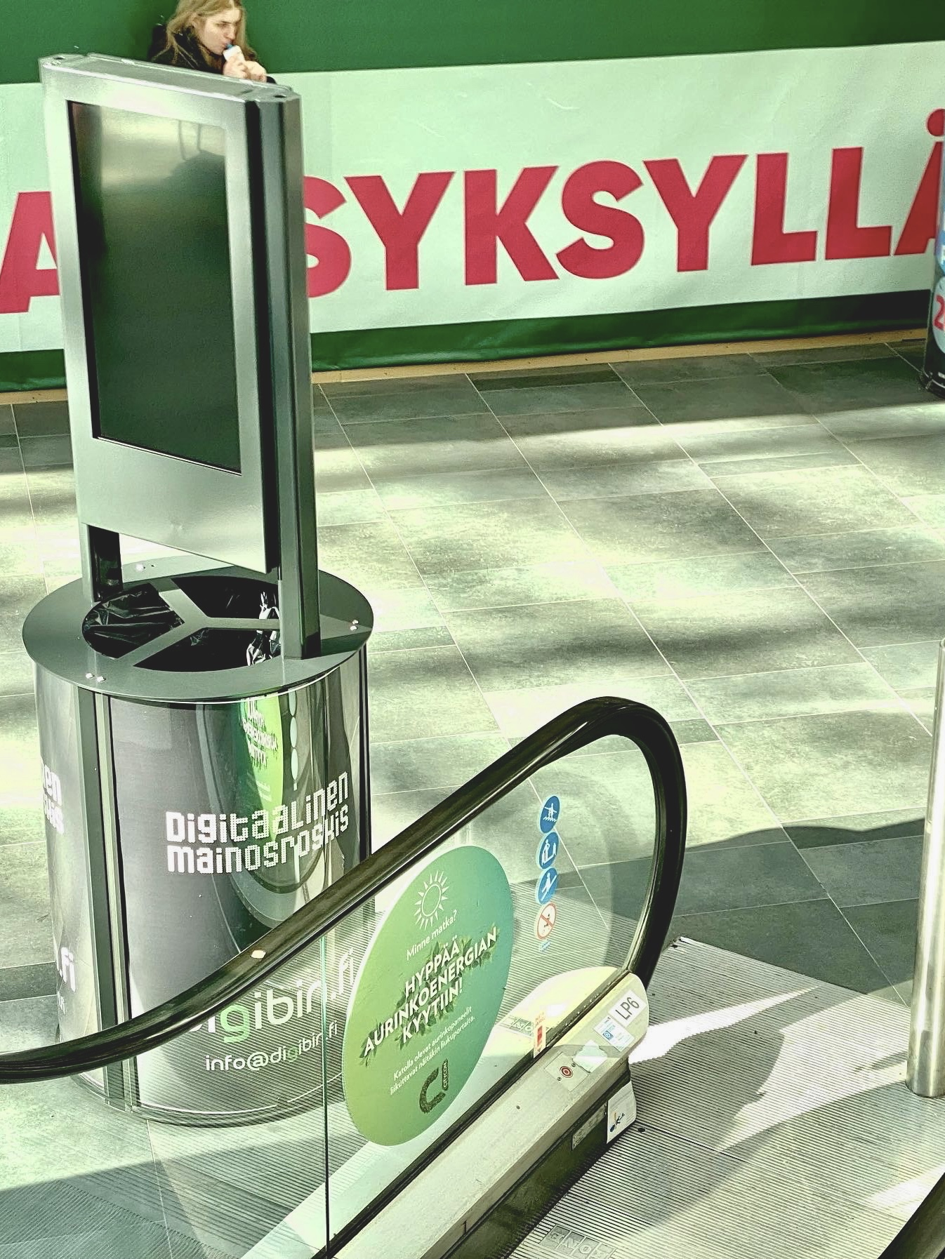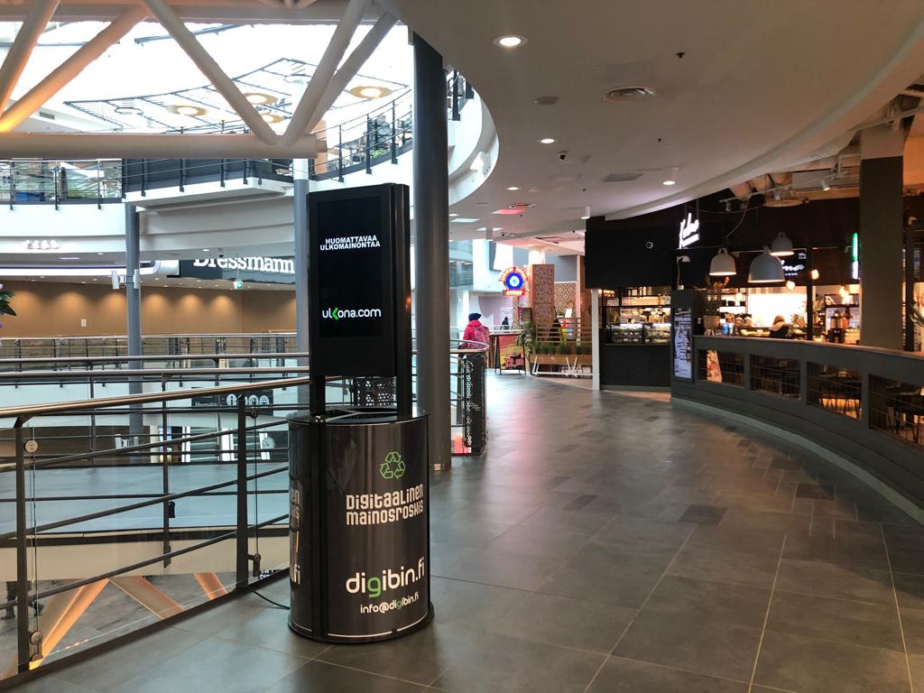 | Kuvaus | Tavoita kuluttajat tehokkaasti läheltä ostopaikkaa. Digibinit sijaitsevat kauppakeskusten parhailla paikoilla. Digitaaliset mainosnäytöt on sijoitettu optimaaliselle katselukorkeudelle, jolloin viestisi on helppo huomata. Digibin on uudenlainen mainoslaite, jossa moderniin mainosroskikseen on integroitu myös digitaalinen mainosnäyttö. Lisätietoa Digibineistä täältä www.digibin.fi |
