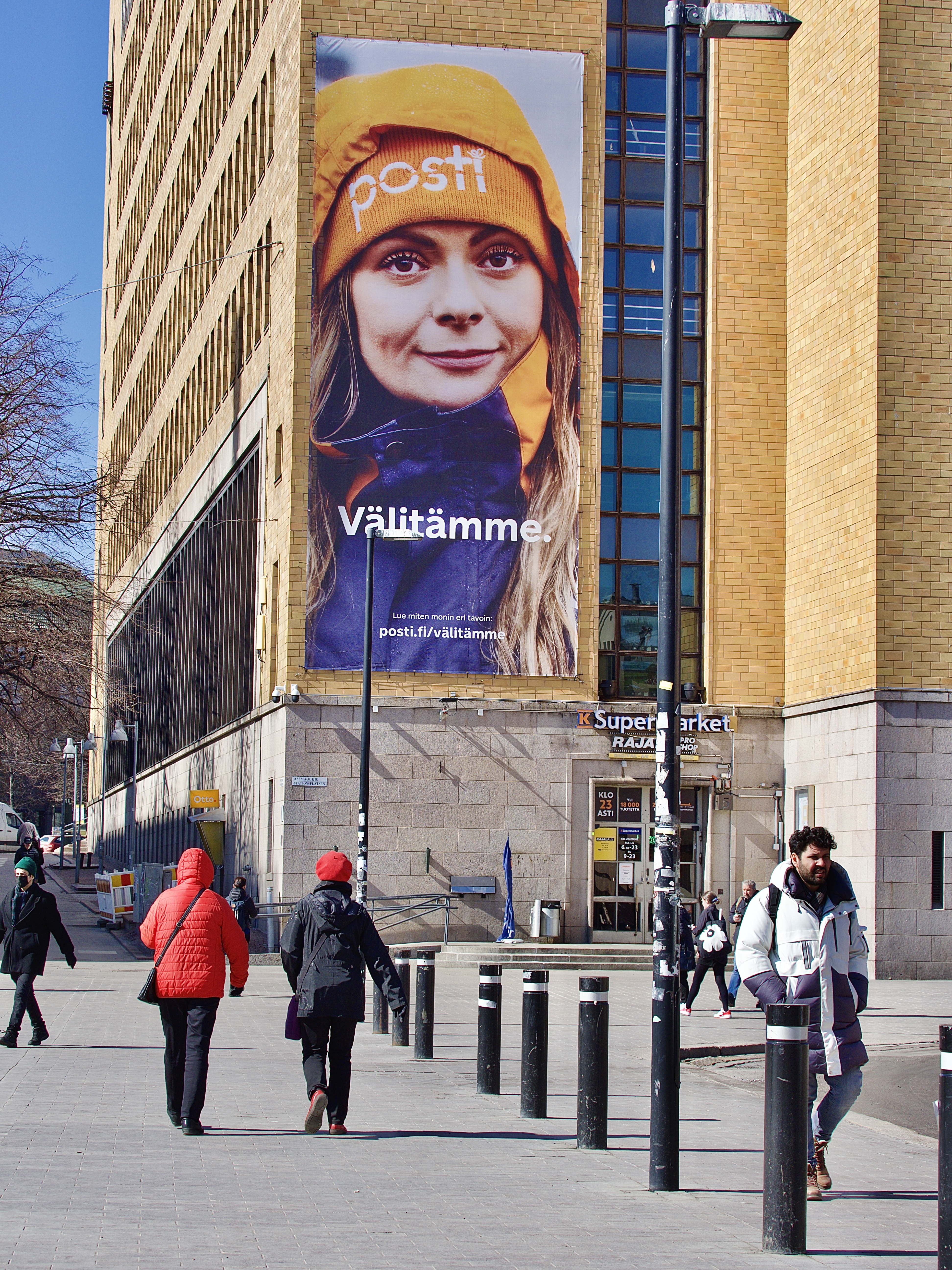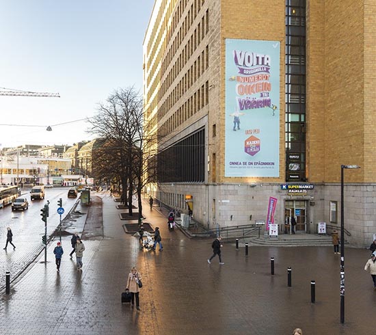 | Kuvaus | Postitalon jättimainospinta sijaitsee aivan Helsingin ydinkeskustassa. Tämän paremmalle paikalle ei pääse! Mainospinta on laadukas ja valaistu. Mainospinnan vastapäätä on päärautatieasema ja yksi vilkkaimmista taksiasemista. Lisäksi mainospinnan edustalla sijaitsee Elielin bussiasema jossa on Helsingin sisäisen liikenteen ja seutuliikenteen lähtö- ja saapumislaitureita. |